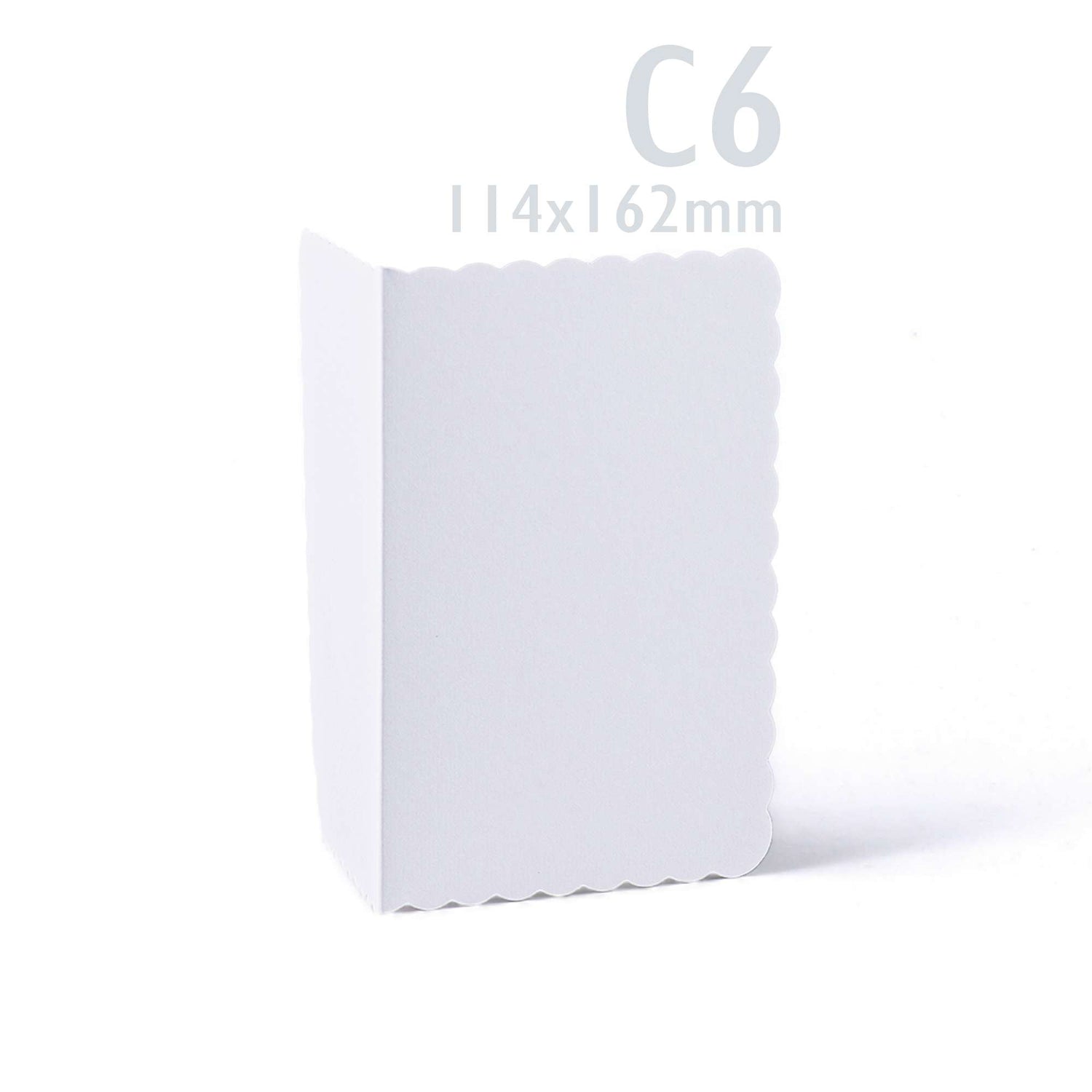 Elegant white scalloped cards (300 gsm) with matching envelopes (100 gsm).